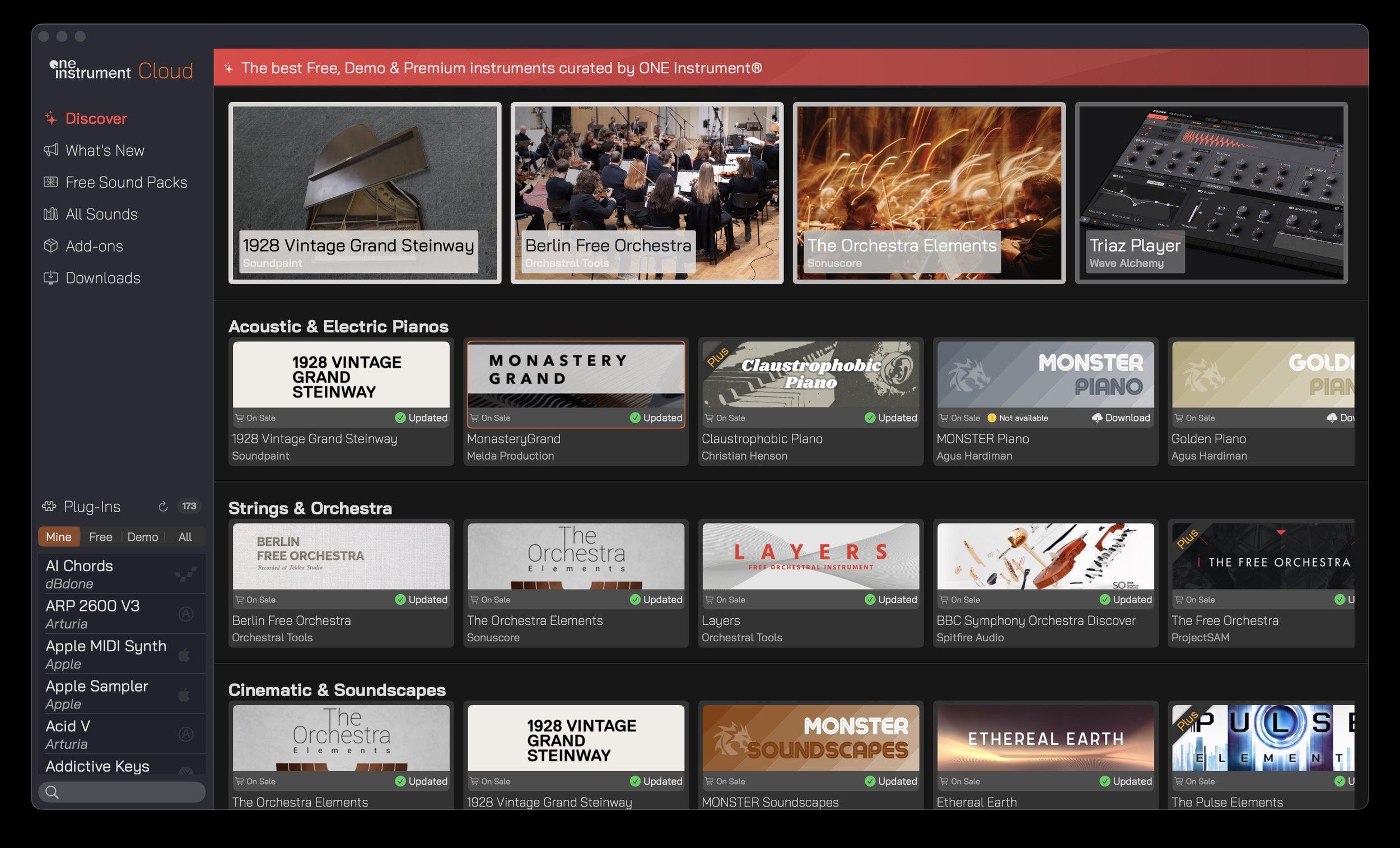 • Access a curated selection of virtual instruments free, including piano, synth, and cinematic tools